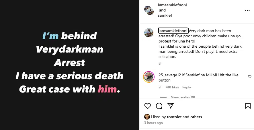 Samklef did not disclose the specifics of his dispute with Verydarkman but asserted his contribution to the activist’s arrest. His Instagram post stated: